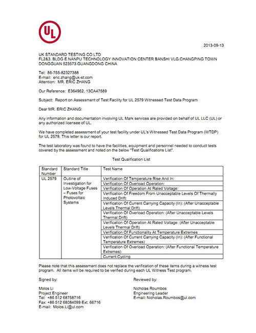 優科實驗室獲得UL美華認證公司授予的PV光伏保險絲 UL2579目擊實驗室資格,可提供PV光伏保險絲產品UL認證及測試服務。